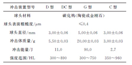 ? ? ?表1中相同的彈性模量采用不同材料選項,是因為表中的E是材料宏觀、靜態的彈性模量,由于金屬中的合金元素及各種化合物在冶金和熱處理過程中會形成多相、彌散、高彈性模量的微觀組織,使材料的動態力學性能發生變化,會使對彈性模量很敏感的里氏硬度發生變化,而不同于基體材料的里氏硬度。通常高合金含量材料會有較高的彈性模量,因此相同彈性模量的鋼材中能夠劃分出合金含量從低到高的2~3種選項。 1.2.2 沖擊裝置的選用 為適用于各種現場環境檢測,里氏硬度計的沖擊裝置型號較多,不同型號具有不同用途,全部型號包括:D型、DC型、S型、E型、D+15型、DL型、C型、G型。其中D型沖擊裝置屬于通用型,通常作為標準配置,用于普通金屬樣品的硬度檢測;DC型沖擊裝置短小,采用特殊的加力環,其他參數與D型沖擊裝置幾乎一致,應用于較小空間的硬度檢測,如孔內、圓柱筒內等;G型沖擊裝置球頭直徑較大,其沖擊能量較高,對被測物表面質量要求較寬泛,適用于表面較粗糙的零件及大型鑄件和鍛件的硬度檢測;C型沖擊裝置較短,沖擊能量約為D型裝置的1/4,適用于表面硬化層、薄層及質量較小的被測物檢測。常用的4種沖擊裝置技術參數見表2。