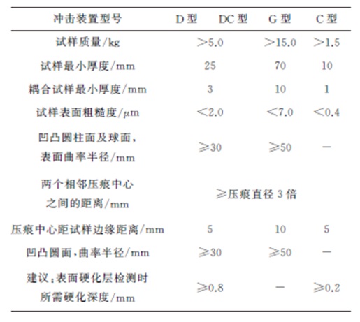 1.2.3 檢測過程 沖擊體與被測物碰撞過程中,未作特殊穩定處理的小質量試樣會在沖擊力的作用下向沖擊方向瞬間加速移動,當碰撞結束后,沖擊體的回彈動能及速度會減小,導致硬度示值小于標準硬度示值。所以被測物質量無法滿足沖擊試驗檢測條件的低要求時需耦合,如在試樣表面和重的支撐物之間施加黏性薄膜。 里氏硬度試驗對被測物厚度要求不僅不能被打穿,還要防止被測物在受到沖擊力時發生彈性或塑性變形的現象發生,所以厚度應該滿足各種沖擊裝置的相關檢測條件。 里氏硬度試驗對被測物表面粗糙度有一定要求,表面粗糙的試樣會導致檢測示值偏低,高硬度的試樣更明顯。通用型(D型)沖擊裝置對被測試樣表面粗糙度Ra要求為小于2.0μm。 與其他各種硬度試驗方法對壓痕間距、壓痕邊距都有一定要求一樣,里氏硬度試驗對壓痕間距也有相應的要求。因一個硬度壓痕及其周圍一定區域內的材料會發生冷作硬化,新壓痕及其應力區應離開前者區域,否則硬度會偏高。 里氏硬度檢測中試驗力應盡量保證垂直于被測物表面,如不能垂直,沖擊體與試樣碰撞后得到的回彈力的方向將偏離沖擊體回彈方向,其回彈速度將小于應有的速度,硬度會偏低。垂直度越差,偏低越明顯。 還需注意凹凸圓柱面及球面的試樣表面曲率半徑對檢測結果的影響,以及檢測表面硬化層的硬度時應注意硬化層的有效厚度。 綜合上述事項,將相關應用要求匯總于表3。
