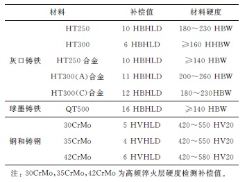 ? ? ?將表4檢測結果的算數平均值按該文3.2節校準方法進行計算,得到以下材料牌號換算時的補償值,見表5,并注明了校準材料基體的硬度范圍,以提高參考價值。
